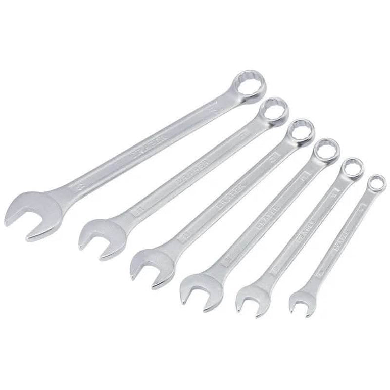 Draper 68478 Redline Metric Combination Spanner Set 8mm - 17mm (6 Piece) Dr-68478.Chrome vanadium steel, hardened, tempered and matt chrome plated. Jaws offset at 15°. Made in accordance with DIN3113A Specifications. Consistes of 6 x Spanners: 8, 10, 12, 13, 14, 17mm. Designed for versatility and easy use, the Draper Redline Metric Combination Spanner Set offers reliable performance and long-lasting durability thanks to its chrome vanadium steel construction and matte chrome plating. Supporting a wide range of applications, it's designed for use in accordance with DIN3113A Specifications, with 15° offset jaws for your convenience.