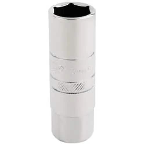 Expert Quality, 6 point deep sockets with a rubber insert for plug protection and retention. Manufactured from chrome vanadium steel hardened and tempered with a polished finish. Socket length 65mm. Each socket has a knurled ring for extra grip. Display packed.