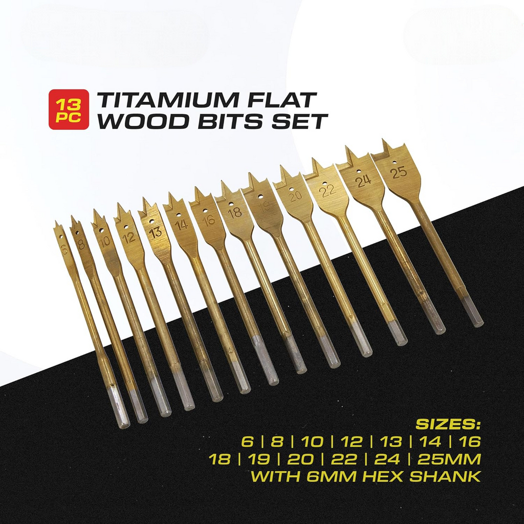 Designed for cutting holes in wood, this 13 piece set has tough, titanium coated flat wood drill bits to ensure a clean cut.