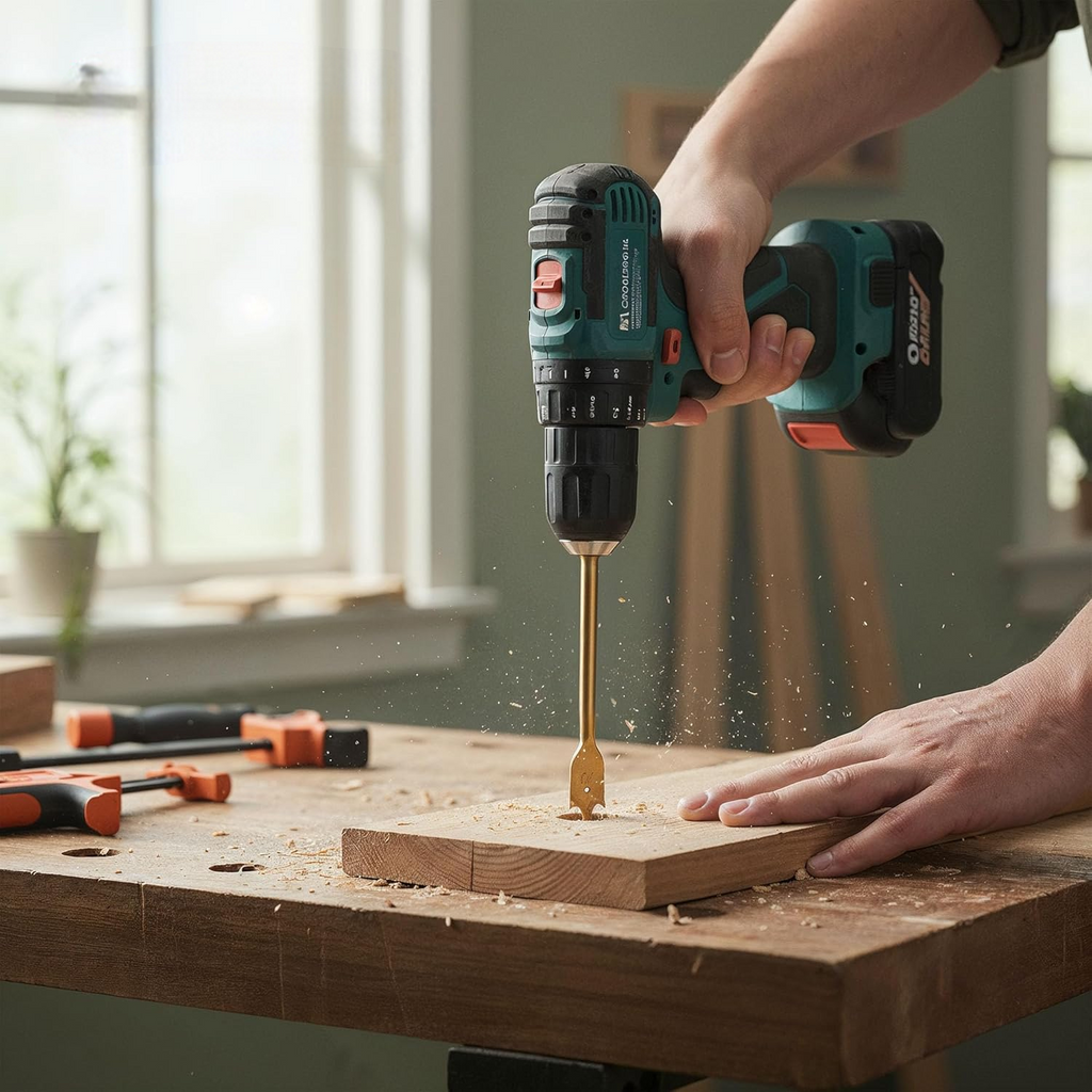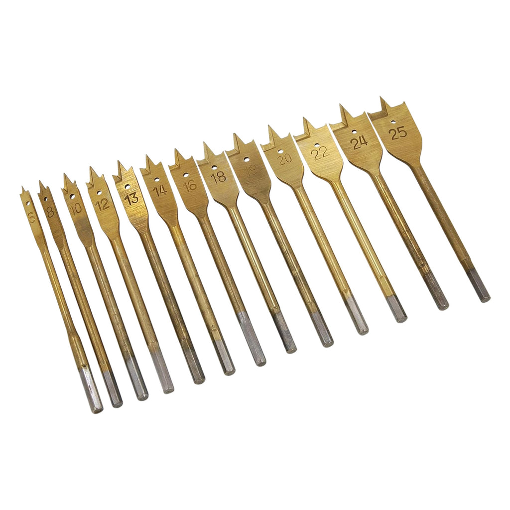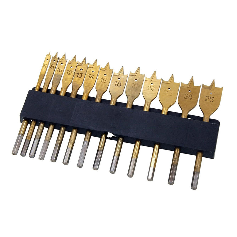 This durable 13 Piece Set of Titanium Coated Flat Drill Bits with 1/4" Hex Shanks will last up to 6 times longer than standard drill bits.