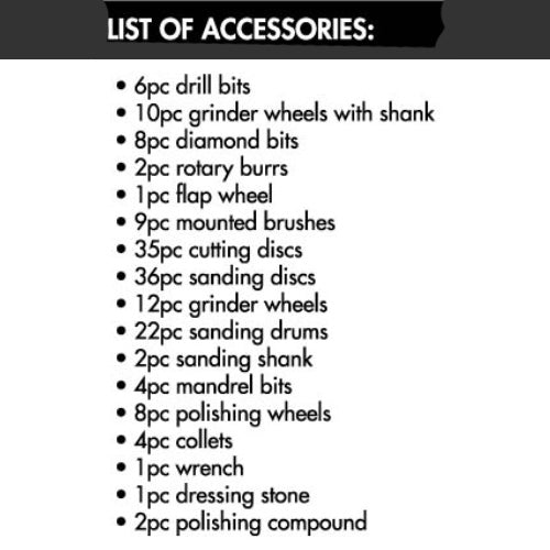 162 Piece Mini Drill and Bit Set comes with a complete assortment of sanding drums, diamond wheels, brushes, sanding discs, wire brushes, twist drills etc.