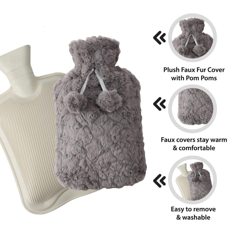 2L Hot Water Bottle Faux Fur Cover & Pom Poms with Soft Faux Fur cover make is comfortable feels & Easy to remove and wash.