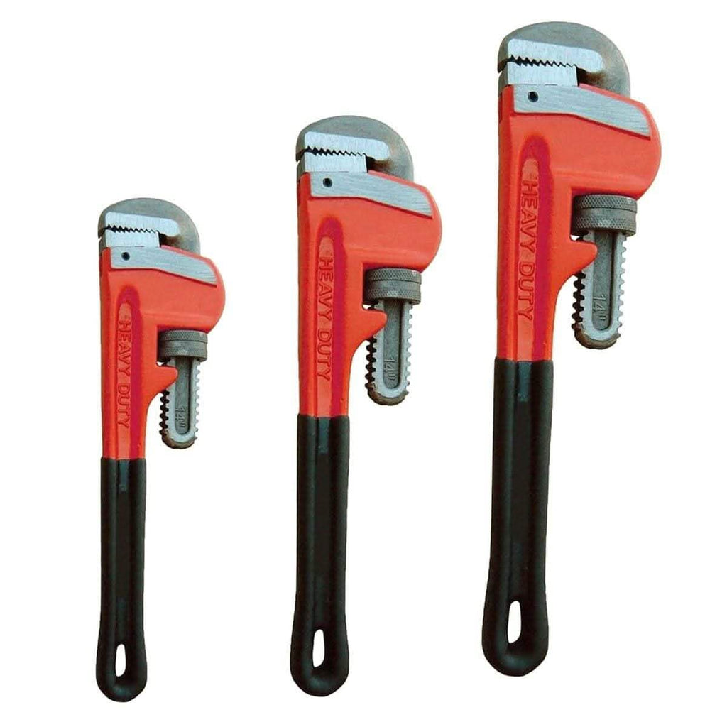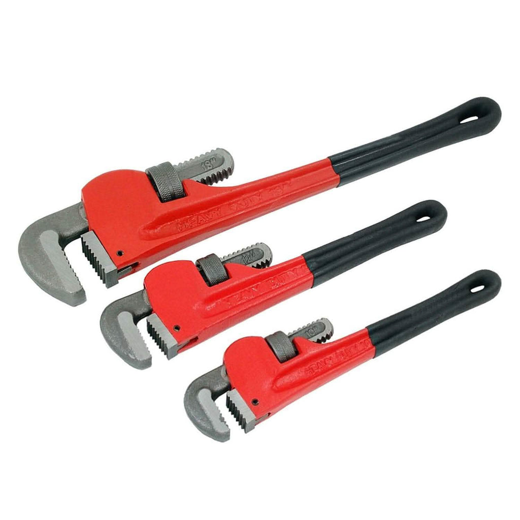 Pack of 3 Extra Heavy Duty Stilson Pipe Wrenches. The set includes 10", 12" and 18" wrenches.