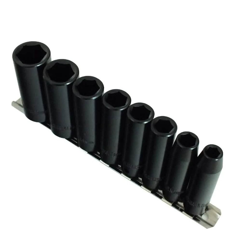 This professional quality 8 Piece Impact Socket Set is made from Chrome Vanadium Steel. The 6 point sockets are hardened, tempered and chemically blacked for corrosion protection. For impact wrenches in workshops, garages, body shops, tyre fitting bays etc. Comes with a storage socket rail.