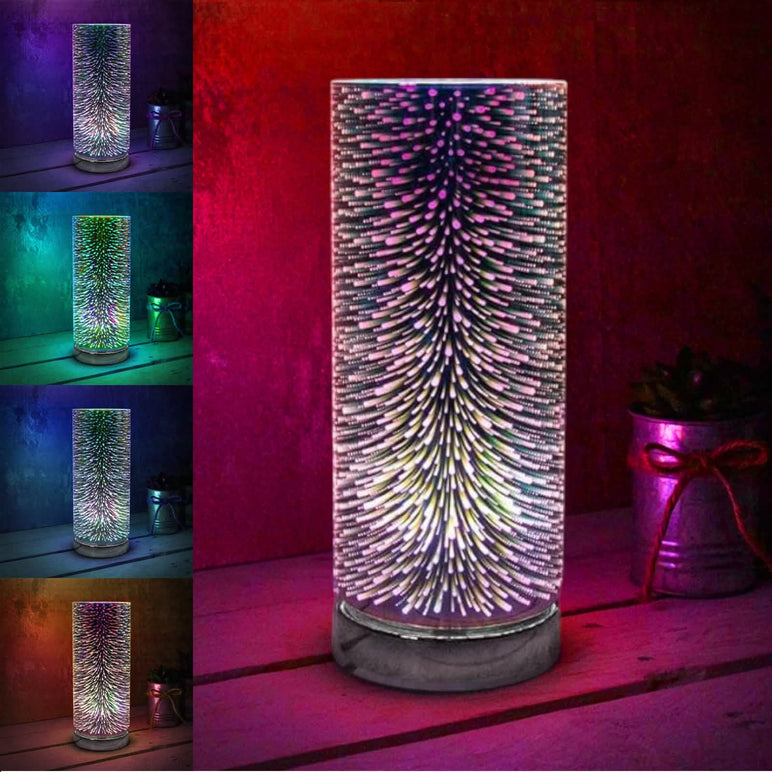LED 3D Fireworks Burst Design: Silver cylinder shape lamp with a captivating LED 3D Fireworks Burst pattern for a stunning visual experience.