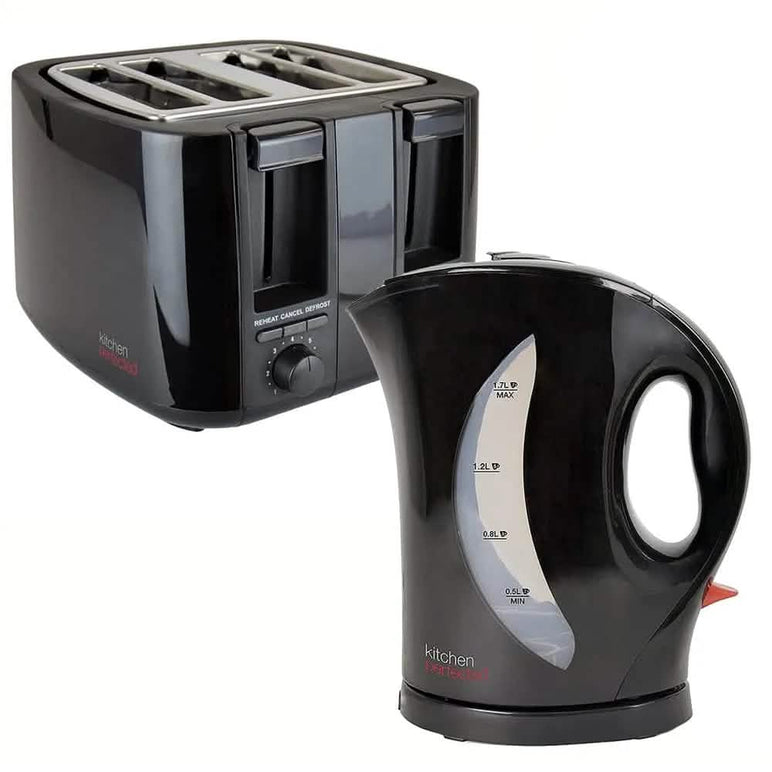 This 4 Slice Wide Slot Toaster & 2000W Fast Boil Electric Kettle Set features a stylish black gloss finish that will bring elegance and style to any kitchen.