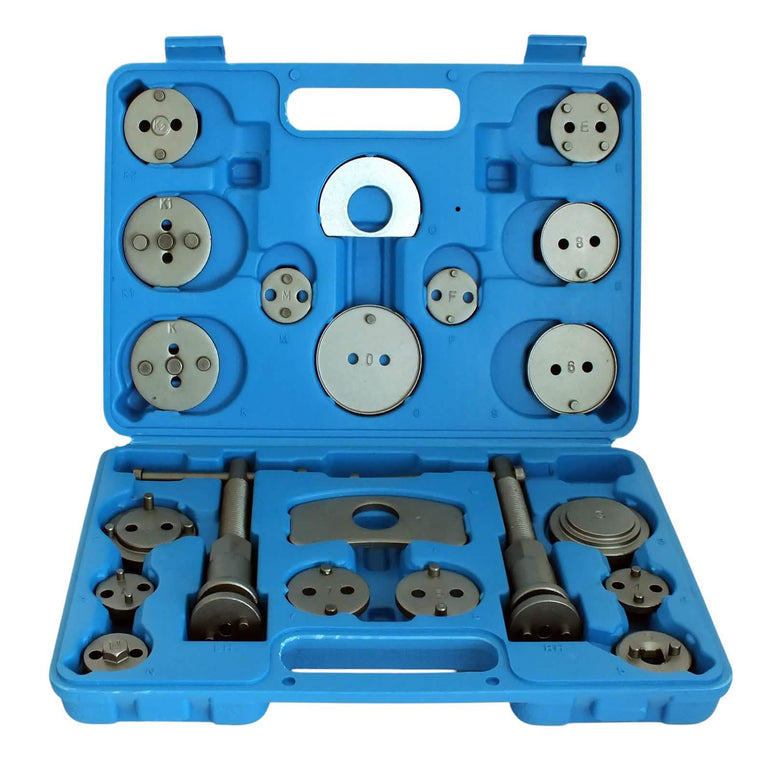 This 21 Piece Brake Caliper Wind Back Kit from Blue Spot Tools is a comprehensive set that features all of the adaptors needed for working on brake calipers for vehicles such as Alfa-Romeo, Audi, BMW, Citroen, Ford, Honda, Jaguar, Land-Rover, Subaru, Mazda, Mercedes, Mini, Mitsubishi, Nissan, Renault, Open/Vauxhall and more.