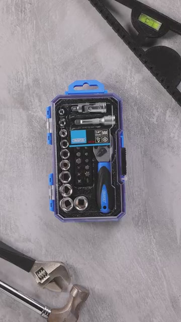 This 1/4" Square Drive Socket Set from Draper Tools includes a 103mm 72-tooth reversible quick-release ratchet, plus a selection of sockets and screwdriver bits.