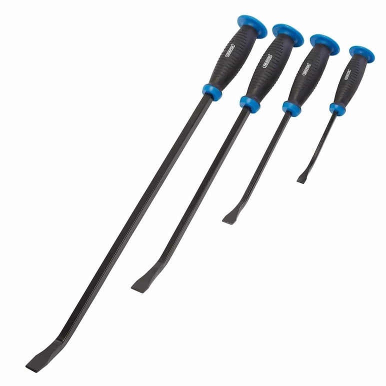 The Draper 4 Piece 'Pound Thru' Soft Grip Pry Bar Set with Hand Guards is a versatile and durable toolset, perfect for heavy-duty tasks. Each pry bar is crafted from hardened and tempered chrome vanadium steel, ensuring long-lasting strength and reliability. The set includes bars in four sizes: 200mm, 300mm, 450mm, and 600mm, offering a range of options for various applications.