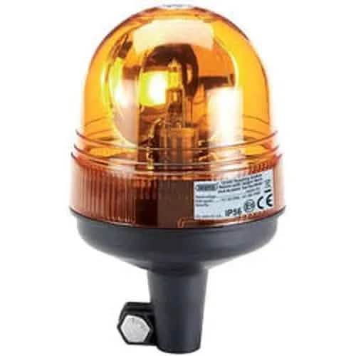 Spigot base rotating beacon, fully certified for use on road vehicles. Manufactured with a heavy - duty base attached to a transparent amber lens and fitted with a bright halogen bulb. Supplied with spigot connector for use on 12/24V vehicles fitted with power poles. Display packed.