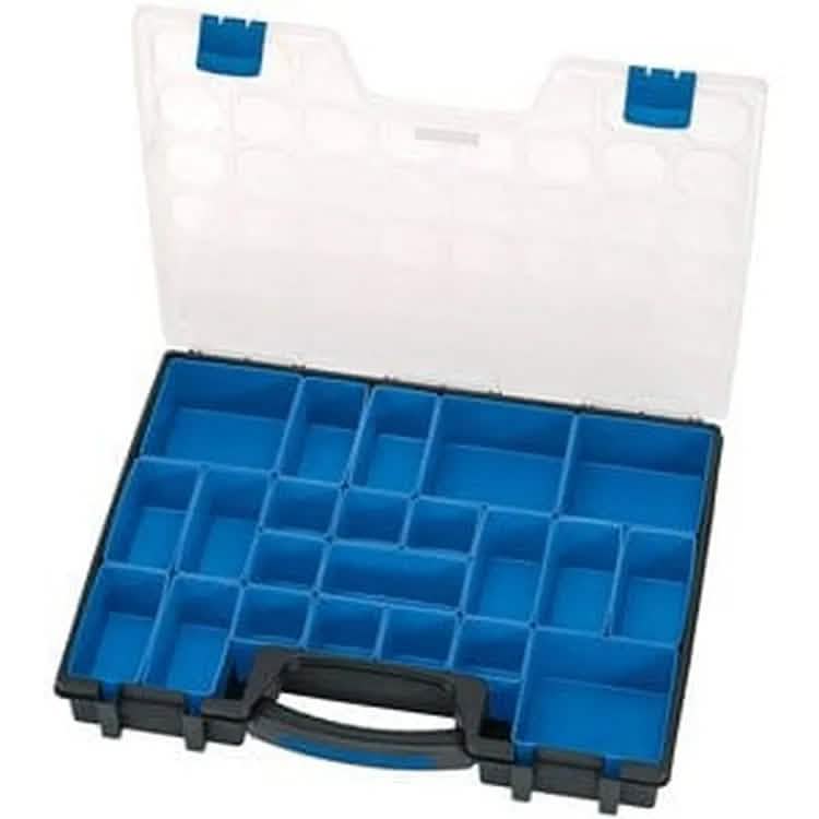 Plastic organiser with an adjustable matrix of lift - out storage compartments. Case has a carrying handle with 'snap fit' closures and clear lid. Sold loose.