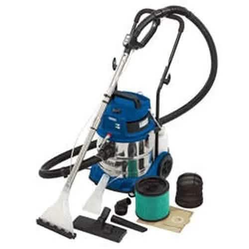 3 in 1 vacuum cleaner ideal for the home, workshop, office and garage environments and especially useful for car valeting. Featuring a variable suction switch and spray facility for valeting carpets, floors, upholstery and hard surfaces. The detergent is added in the form of a pressurized spray. This cleaner is also designed to pick up dry material. It has a 20L tank and 4L detergent capacity. Fitted with 10M (approx.) cable and approved plug. Display carton. This cleaner is Supplied with the following; Paper dust bag, Cartridge filter, Anti foam filter, 3m flexible hose, Stainless steel retractable extension tube, Ergonomic trigger with remote start stop function, Round brush, Crevice nozzle, Multi use brush with metal base and retractable brush, Small spray - suction nozzle, Large spray - suction nozzle + squeegeeAll accessories are 35mm diameter