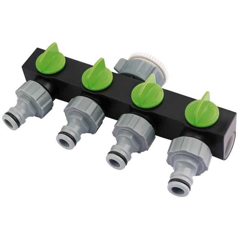 Draper 4-Way Hose Connector 26333.Connectors made from robust plastic suitable for use with garden hose, sprinklers and taps.5010559263332.PartNo-GWPPTC4.Draper 26333.