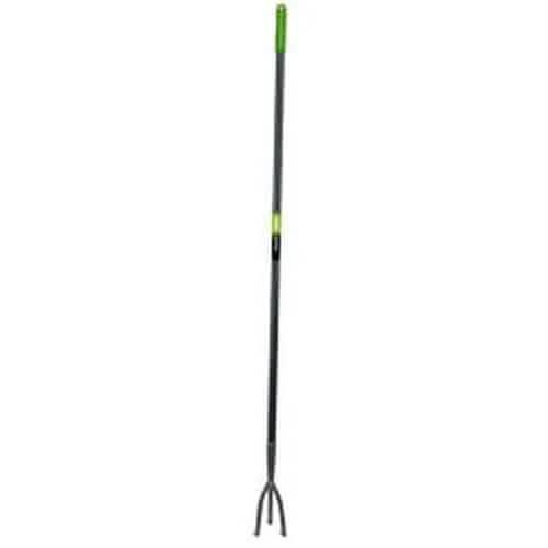 Three prong head with epoxy coated finish. Head securely fixed to tubular steel handle. With black plastic hand grip with hang hole. Sold loose.