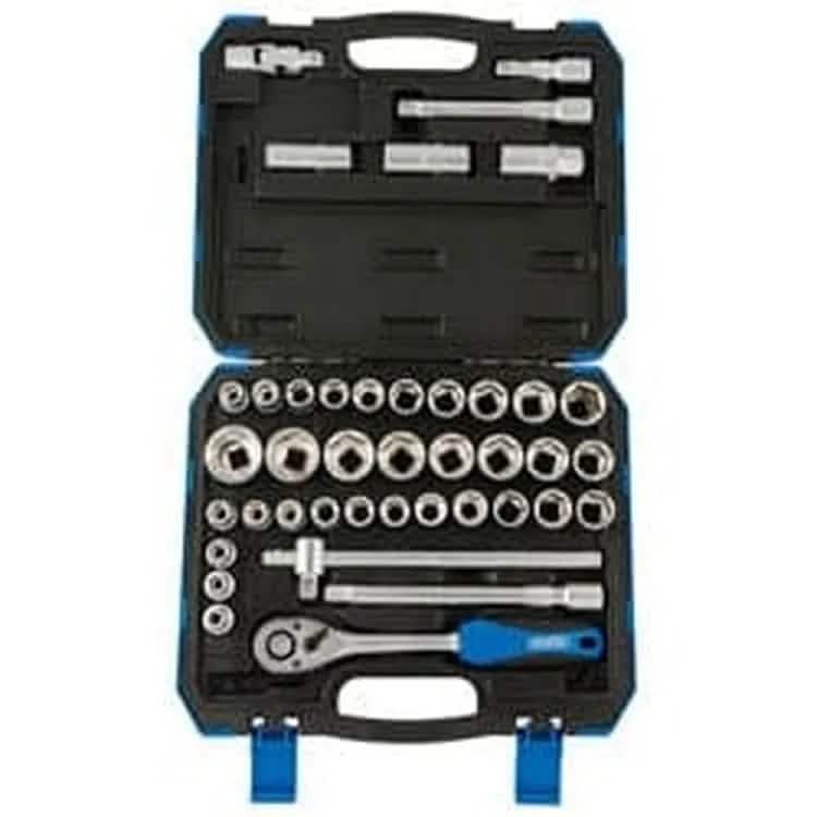 Contents:: 16 x Metric sockets: 8, 9, 10, 11, 12, 13, 14, 15, 16, 17, 18, 19, 20, 21, 22, 24, 25, 26, 27, 28, 30, 32mm 10 x Imperial sockets: 7/16, 1/2, 9/16, 5/8, 11/16, 3/4, 13/16, 7/8, 5/16, 1" AF 3 x Spark plug sockets: 10, 12, 14mm 1 x 72 tooth reversible ratchet with soft grip handle and "quick release" button 3 x Extension bars: 75, 125, 250mm 1 x Sliding 'T' bar 1 x Universal joint