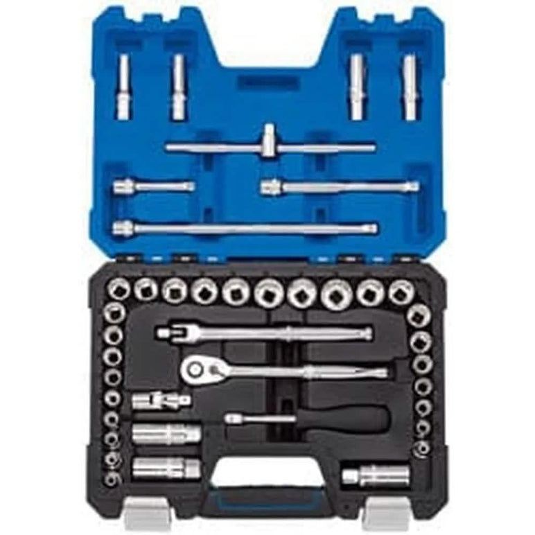 Contents:: 17 x Metric sockets: 6, 7, 8, 9, 10, 11, 12, 13, 14, 15, 16, 17, 18, 19, 20, 21, 22mm 4 x Metric deep sockets: 8, 10, 12, 13mm 9 x Imperial sockets: 1/4, 5/16, 3/8, 7/16, 1/2, 9/16, 5/8, 11/16, 3/4" 3 x Spark plug sockets: 10, 12, 14mm 1 x 72 tooth reversible ratchet with "quick release" button 3 x Wobble extension bars: 75, 150, 250mm 1 x Sliding 'T' bar 1 x Flexible handle 1 x Universal joint 1 x Spinner handle