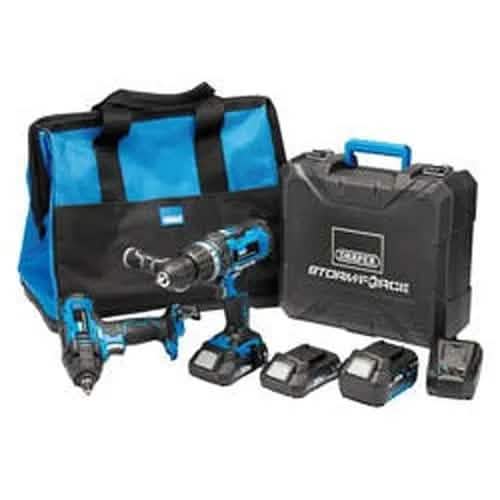 Storm Force° 20V cordless workshop kit, containing tools for everyday workshop use. Supplied with 20V combi drill, 20V 1/2" impact wrench, 2 x 2.0Ah li-ion batteries, 1 x 4.0Ah li-ion battery and charger. All stored in a 440mm hard bottom tool bag for easy transportation and storage.