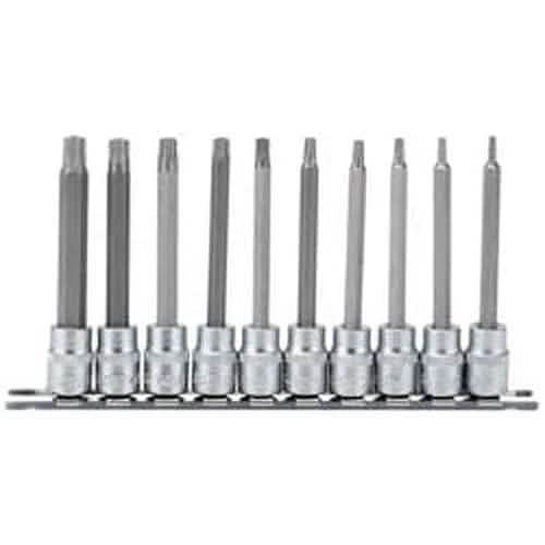 Expert Quality, 10 Draper TX - STAR security socket bits, 100mm long. All sockets manufactured from hardened and tempered chrome vanadium steel with sand blasted bits of S2 silicon steel. Each socket has a knurled ring for extra grip. Supplied on a steel socket retaining rail. Display packed.