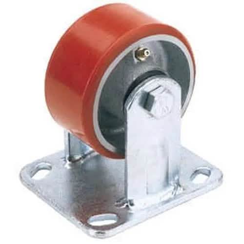 Fixed plate fixing. High tear strength, up to twice the service life of rubber wheels with good load carrying capacity. Steel wheel centre, needle roller bearing and grease nipple. Carton packed.