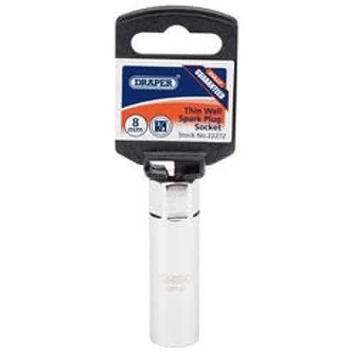 8mm thread (14mm socket) thin wall 12 point spark plug socket with rubber insert for plug protection and retention. Suitable for use with most Citroën vehicles, Peugeot 207, 307, Renault 1.2 16v, BMW, BMW Mini and Mercedes with limited clearance. Chrome vanadium steel hardened, tempered, chrome plated and polished for corrosion protection. Socket length 65mm. Display packed.