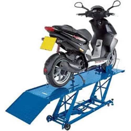 All steel construction with heavy duty foot operated hydraulic pump and ram assembly. Safety table lock device to prevent accidental lowering. Adjustable front wheel clamp and wheel stop bar. Removable rear panel to facilitate rear wheel changes. Base assembly fitted with transport wheels and lock downs to prevent lift from moving whilst in use. Table surface is stippled for safety and grip whilst loading motorcycles. Supplied in wooden crate.