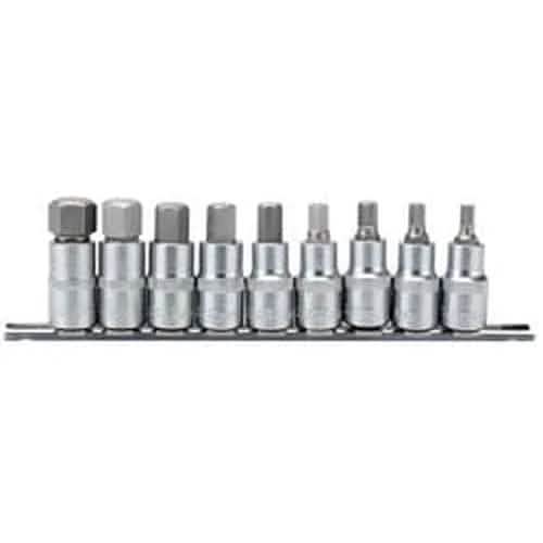 Expert Quality, 9 sockets fitted with hex insert bits. All sockets manufactured from hardened and tempered chrome vanadium steel with sand blasted bits of S2 silicon steel. Each socket has a knurled ring for extra grip. Supplied on a steel socket retaining rail. Display packed.