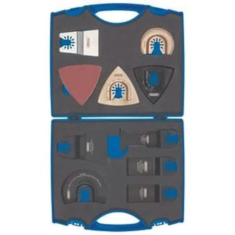 Contents:: 1x 34mm plunge cutting blade 1 x 34mm triple ground cutting blade 1 x 44mm plunge cutting blade 1 x 68mm cutting 1 x 68mm triple ground cutting blade 1 x 88mm circular cutting blade 1 x 78mm carbide rasp 1 x 64mm carbide cutting blade 1 x 80 x 80 x 80mm abrasive backing pad 10 x 80x80x80mm aluminium oxide sanding sheets (5 x 80grit & 5 x 120grit) 1 x scraper blade