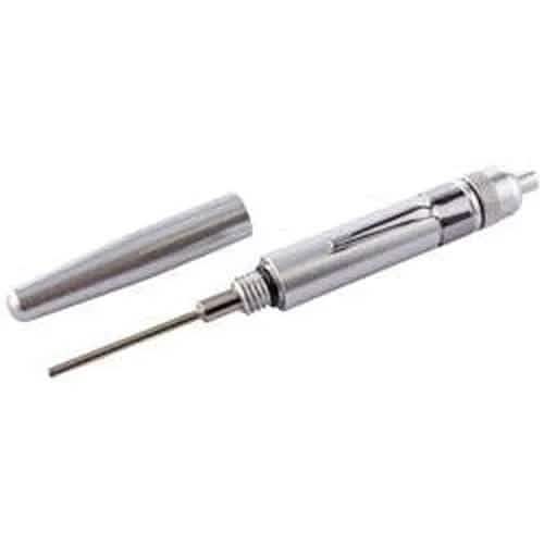 Polished aluminium with steel pocket clip. Designed for pinpoint lubrication to small and awkward areas. 40mm length applicator needle with brass flow control button for fine control. Display packed.