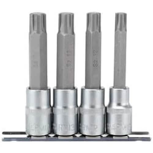 Expert Quality, 4 Ribe socket bits, 100mm long. All sockets manufactured from hardened and tempered chrome vanadium steel with sand blasted bits of S2 silicon steel. Each socket has a knurled ring for extra grip. Supplied on a steel socket retaining rail. Display packed.