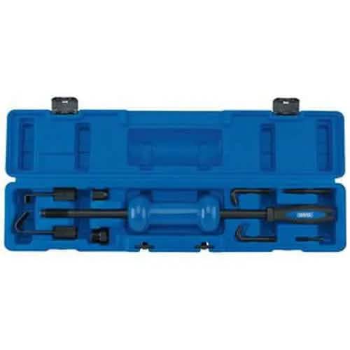 Contents:: 1 x 2.3kg slide hammer with 470mm shaft 1 x M16 x 1.5 threaded end for attachments 1 x Large flat hook 1 x Small flat hook 1 x Large round hook 1 x Small round hook 1 x Screw holder 1 x Self - tapping screw 1 x Tapered screw 1 x Adaptor