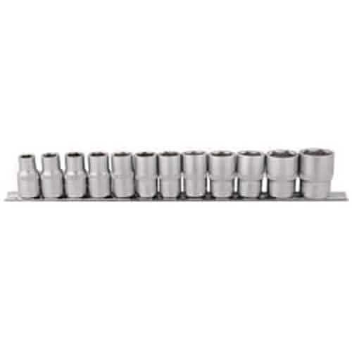 Manufactured from chrome vanadium steel, hardened and tempered with a satin finish. Each socket has a knurled ring for extra grip. Supplied on a metal socket rail for secure storage. Display packed.
