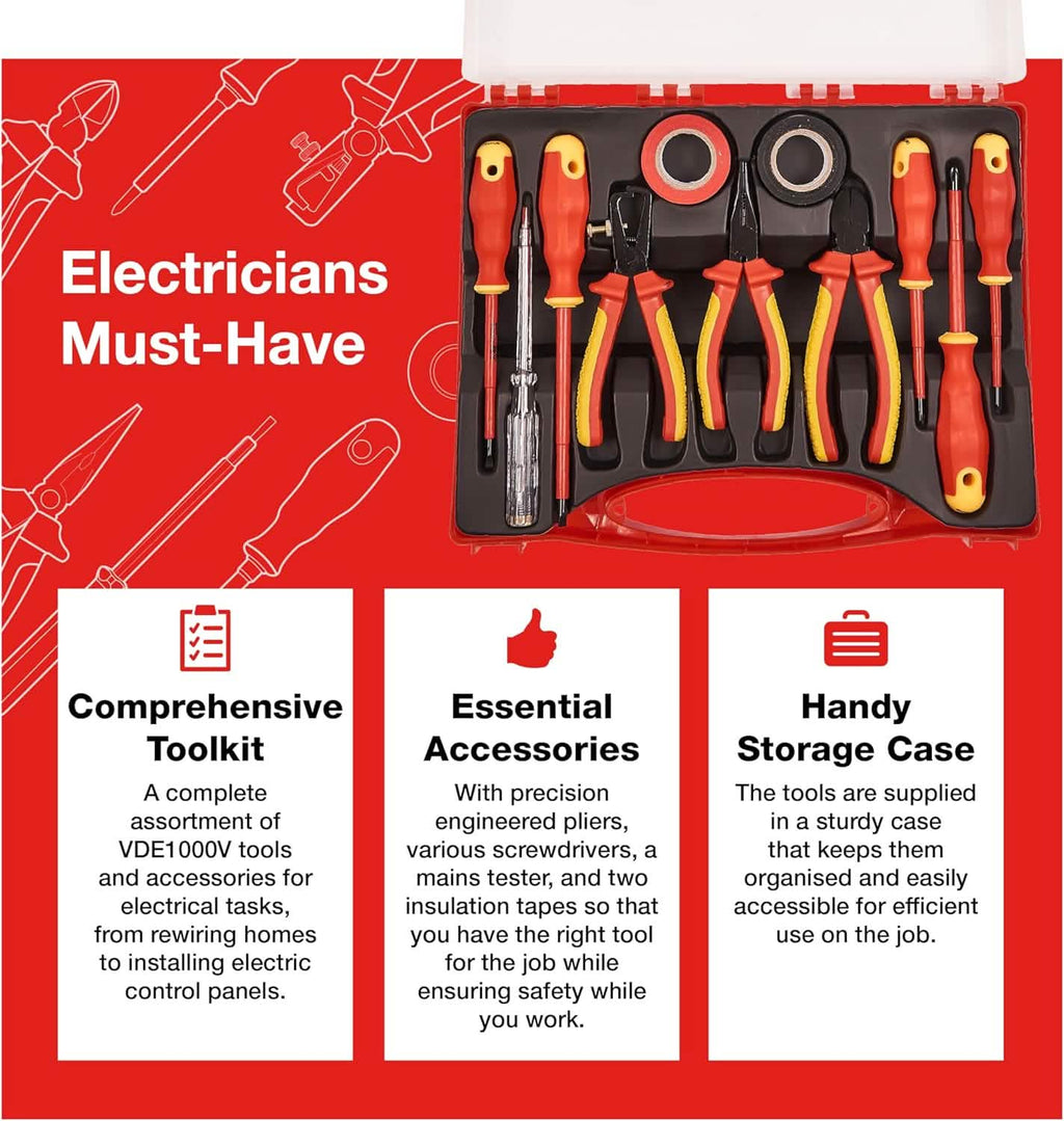 ✔ COMPREHENSIVE ELECTRICIAN'S TOOLKIT: The Amtech L0510 is an 11-piece VDE 1000V Electricians Toolkit, offering a comprehensive assortment of tools and accessories for electrical tasks.