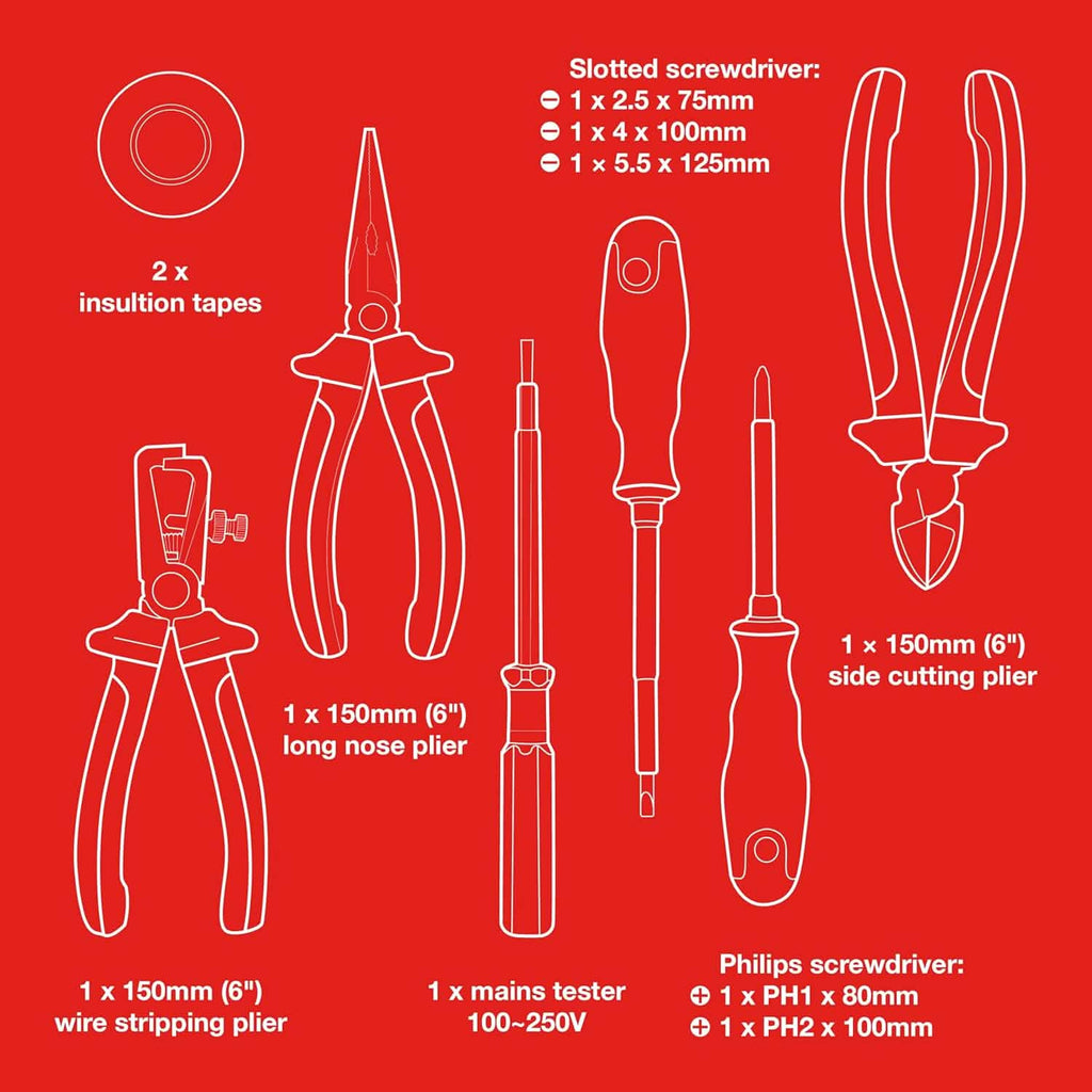 ✔ ESSENTIAL ACCESSORIES: Comes with a mains tester (100-250V) and two insulation tapes, providing essential equipment for electrical safety and maintenance.