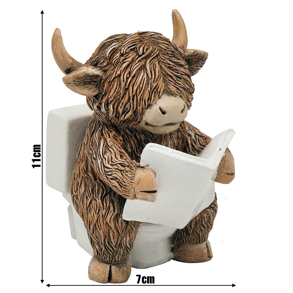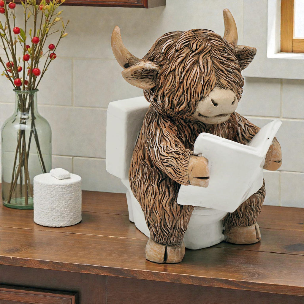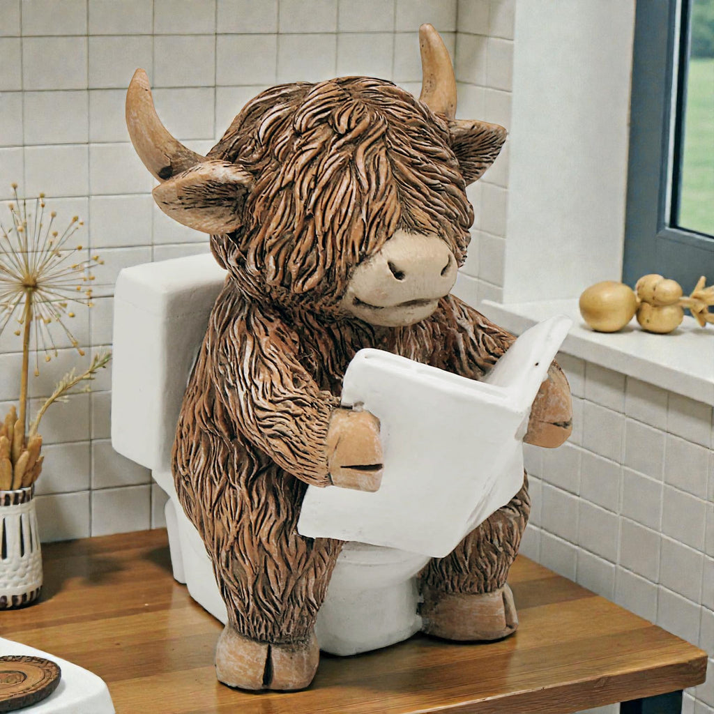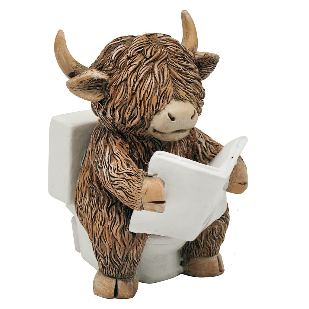Happy Highland Cow on the Loo Reading a Newspaper