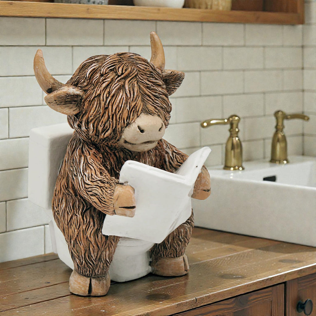This one features a Highland Cow sitting on the toilet reading a newspaper.