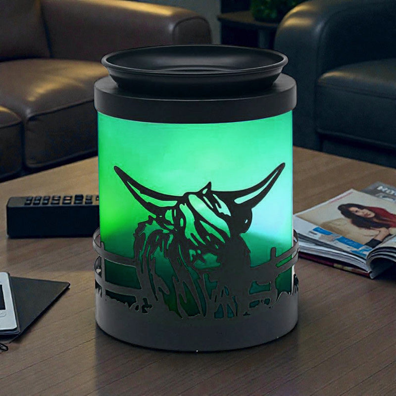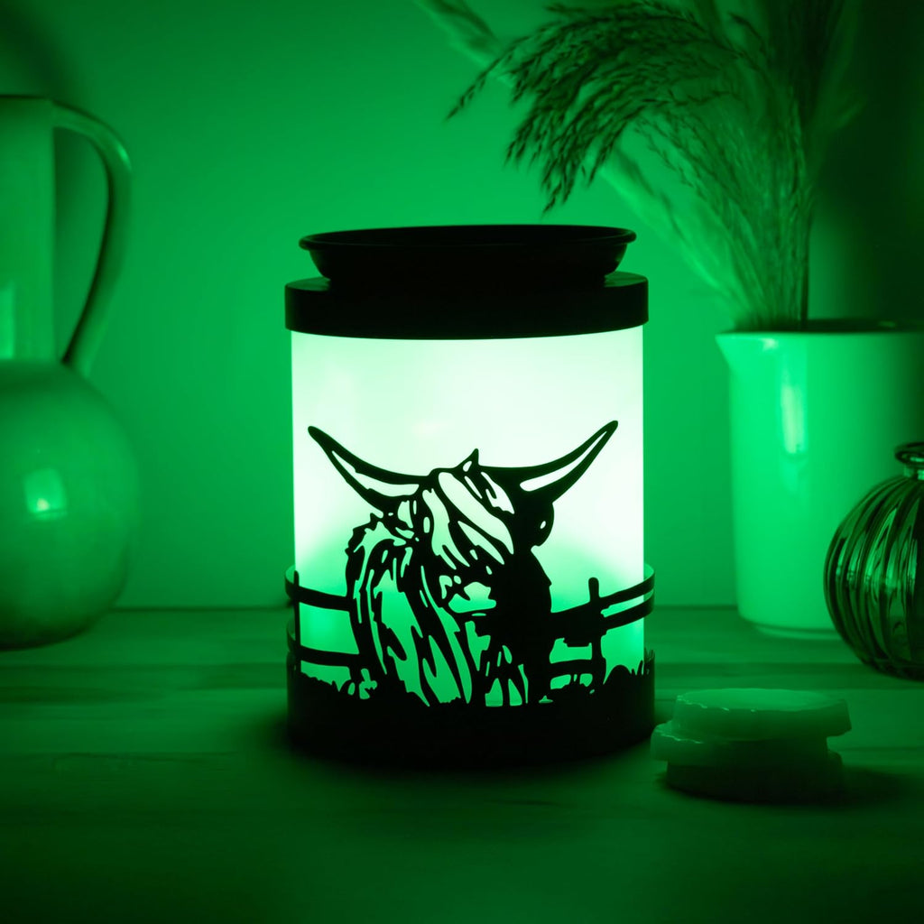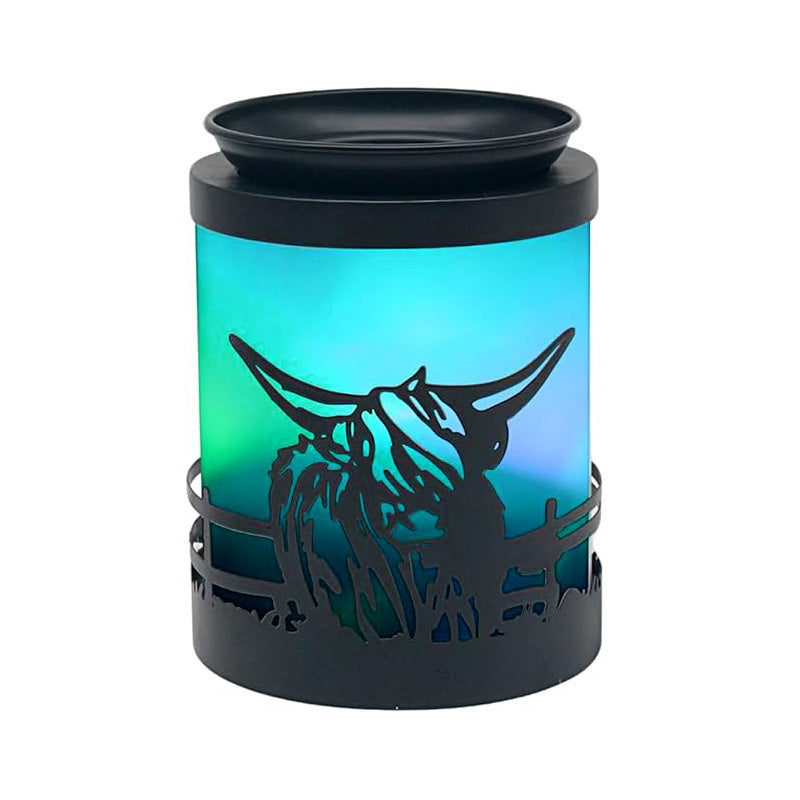 Add a touch of cosy charm to your home with this Colour Changing LED Northern Lights Effect Aroma Lamp with Highland Cow Silhouette.