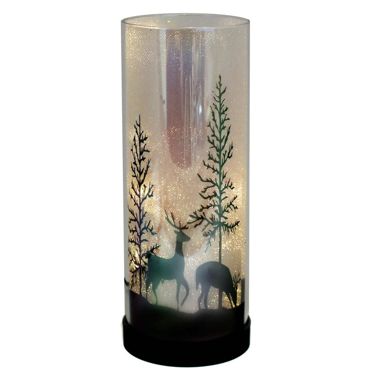 A sophisticated diffuser film inside the lamp splits up the light from the internal warm-white LEDs into a myriad points of light which then frame a Winter scene of deer, stag and fir trees, giving a bright sparkling frost effect to the entire lamp.