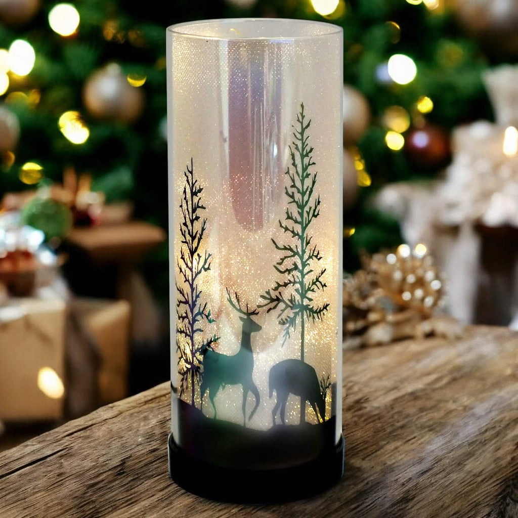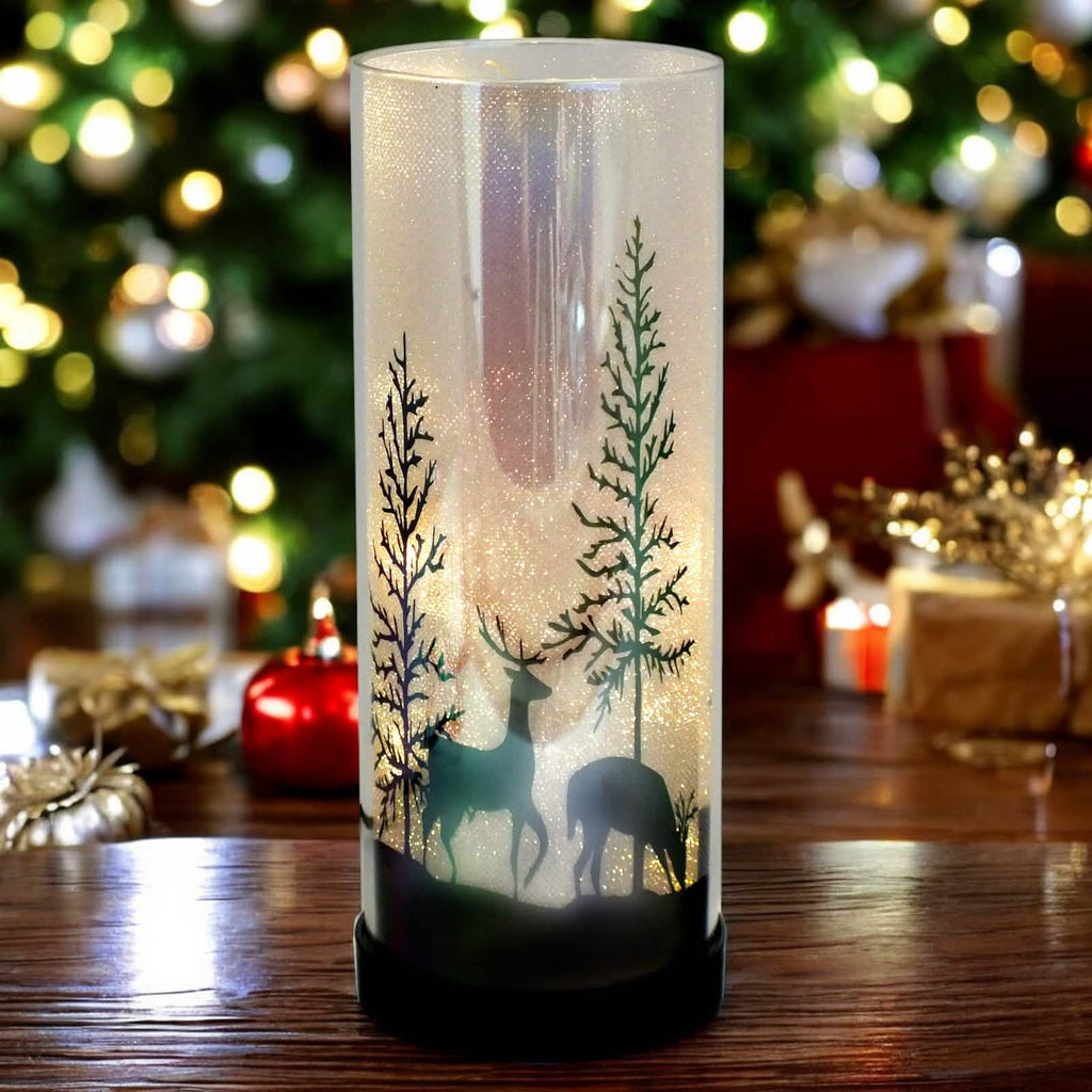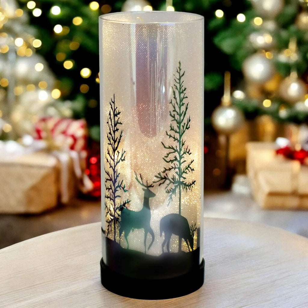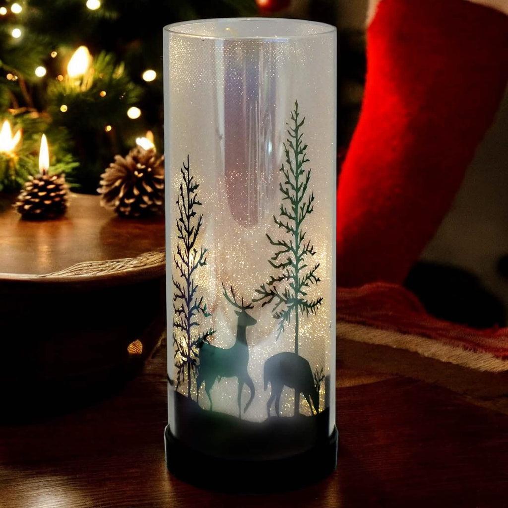 A sophisticated diffuser film inside the lamp splits up the light from the internal warm-white LEDs into a myriad points of light which then frame a Winter scene of deer and fir trees, giving a bright sparkling frost effect to the entire lamp.
