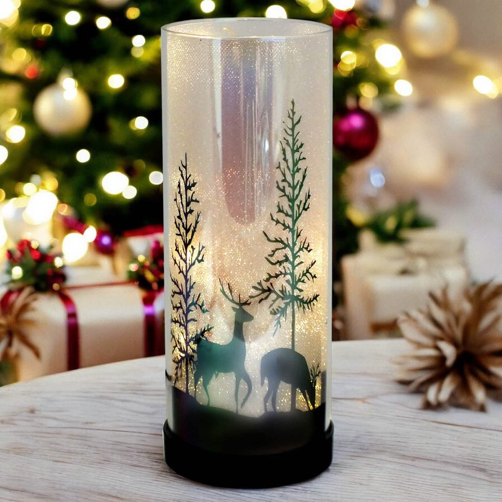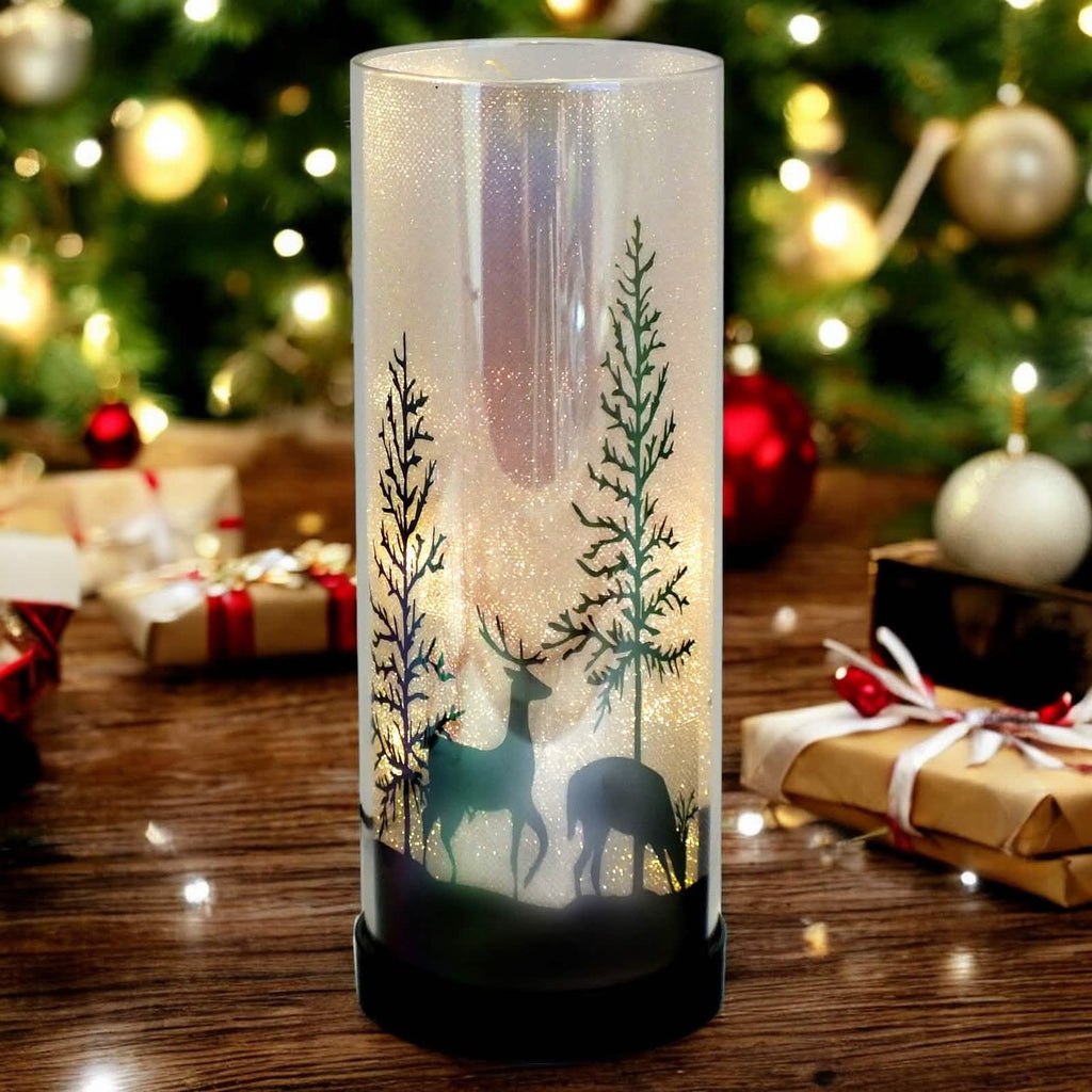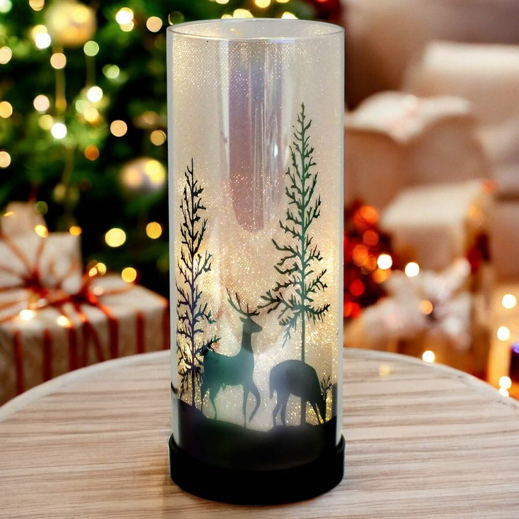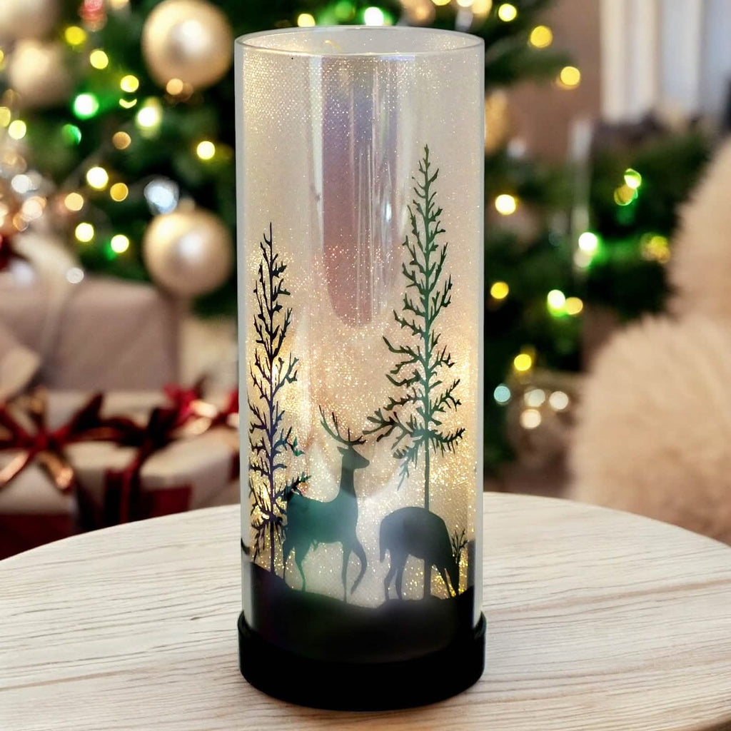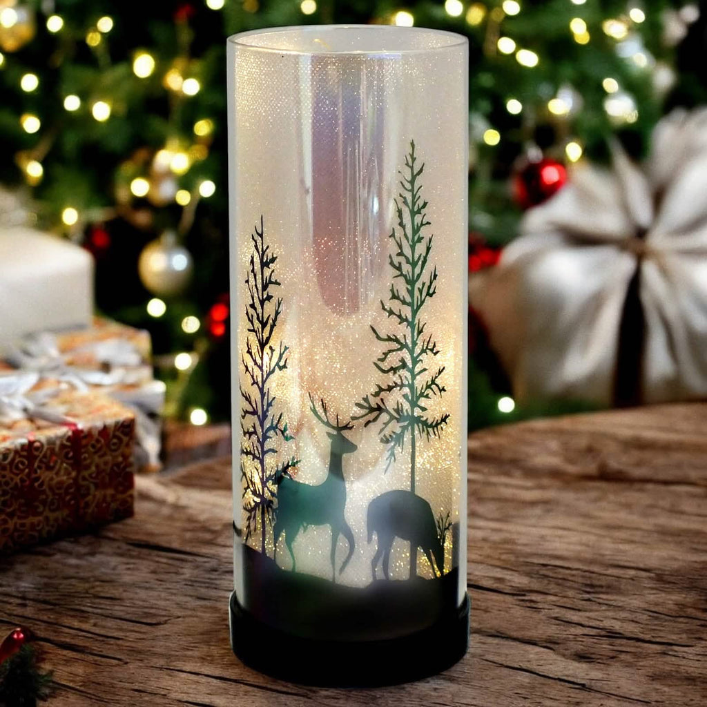A sophisticated diffuser film inside the lamp splits up the light from the internal warm-white LEDs into a myriad points of light which then frame a Winter scene of deer and fir trees, giving a bright sparkling frost effect to the entire lamp.
