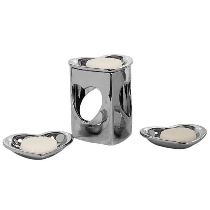 Luxury Ceramic 3 Dish Heart Wax Aroma Warmer Tea Light Holder - Silver Chrome Finish
