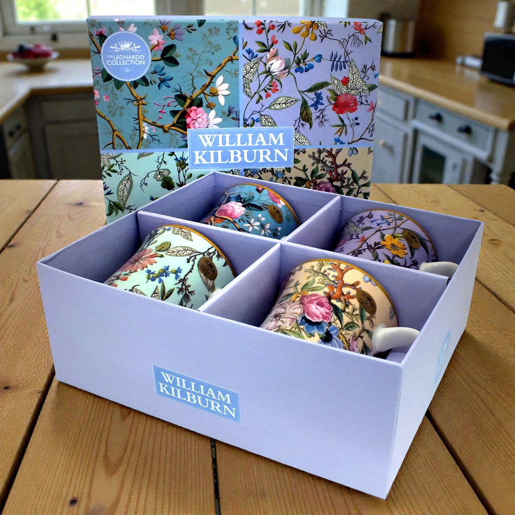 Set of 4 Mugs Coffee Tea Fine China Floral Collection | William Kilburn Designs with Gift Box