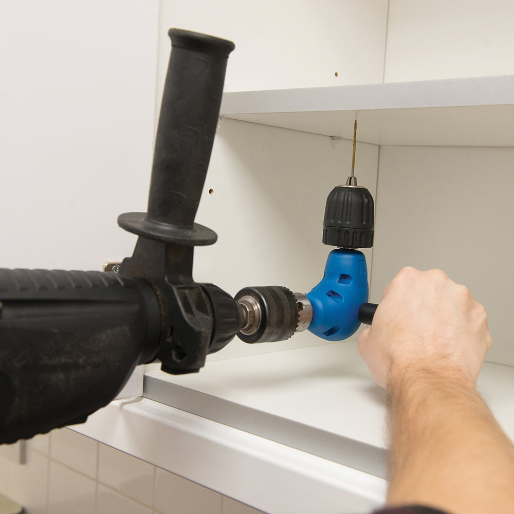 Its compact right-angle design allows both left- and right-handed users to comfortably drill where standard drills cannot easily reach.