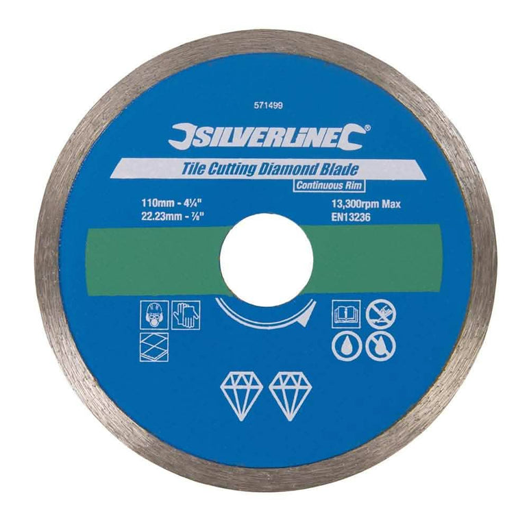 This 110 X 22.23mm Continuous Rim Tile Cutting Diamond Blade 571499 is an ideal addition to anyone's tools , whether it be for the garden , garage  or  DIY