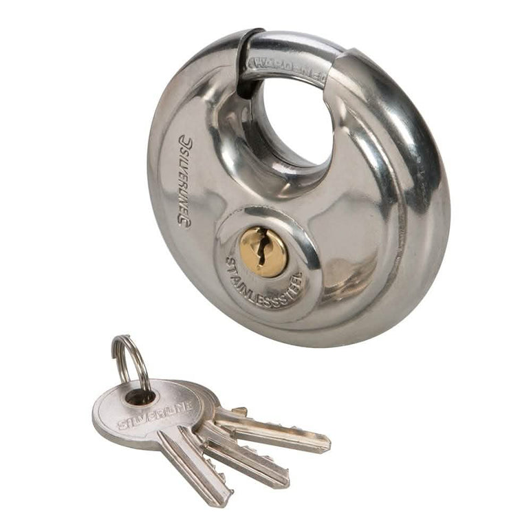 � Stainless Steel Disc Padlock � 70mm � Heavy duty stainless steel construction with maximum corrosion resistance � Hardened rotary action double-locking steel shackle provides extra protection against hacksaw and cropping attacks � Laser-welded lock body limits moisture ingress and protects internal locking mechanism, which is double-bolted for extra strength to resist torsion and pull attacks � 5-pin cylinder increases protection against picking � Warranty: LIFETIME for all hand tools ; 3 YEAR for power tools , air & petrol tools. � Silverline-Tooltime 292707 5060012965365