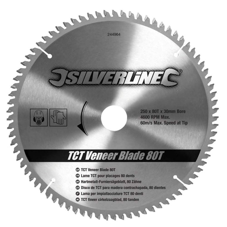 This 250 X 30 - 25, 20, 16mm Rings Tct Veneer Blade 80t 244964 is an ideal addition to anyone's tools , whether it be for the garden , garage or DIY