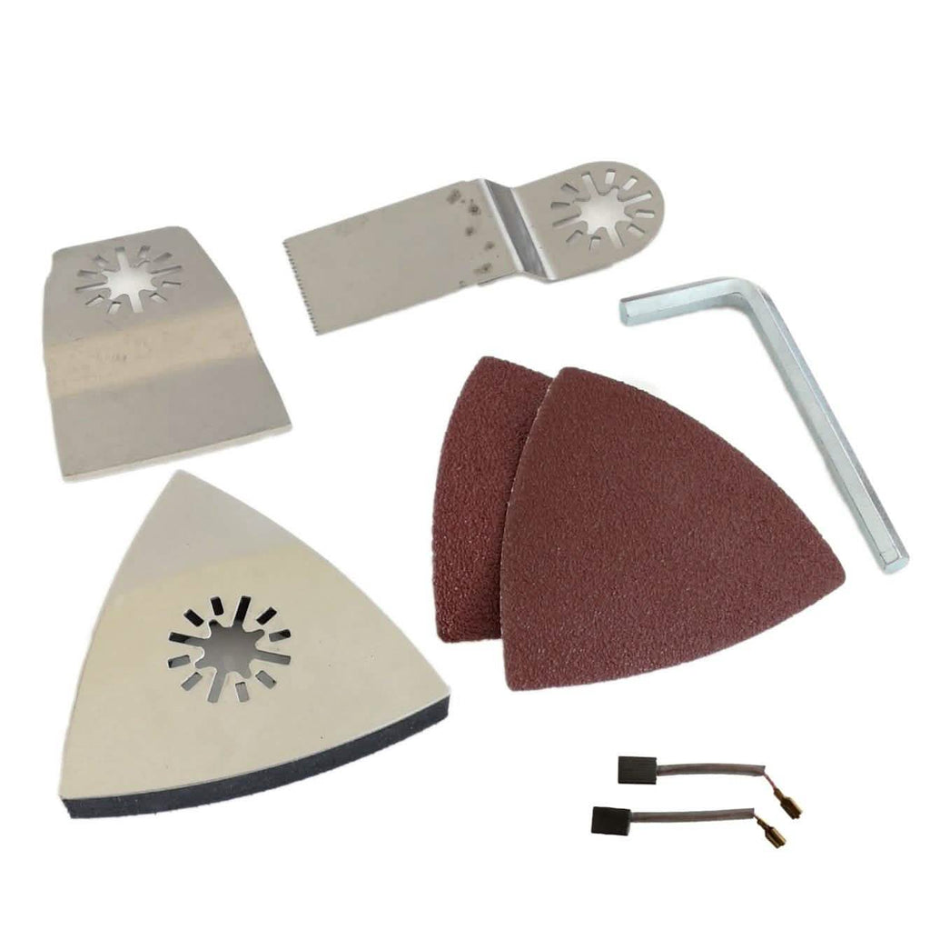 Designed for efficiency, this multi-function tool comes with a 2m cable and a standard UK 3-pin plug for effortless use. The comprehensive kit includes essential accessories such as a backing pad, P60 and P80 sanding sheets, a hex key for swift tool changes, an offset rigid scraper for challenging scraping tasks, and an offset universal saw blade suitable for wood, plastic, and metal. The kit also features a carbon brush set for prolonged performance.