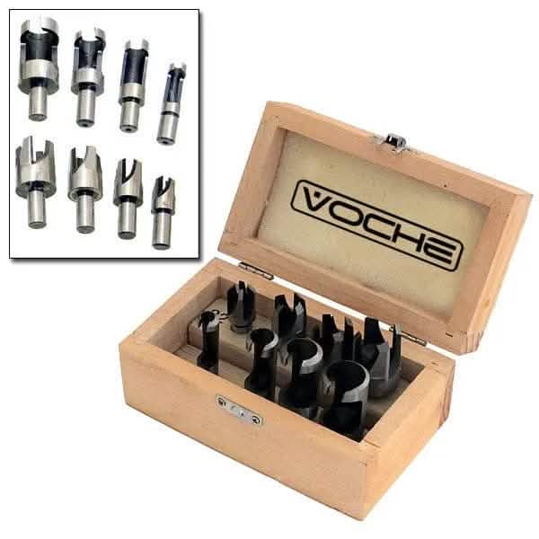 This Voche 8 Piece Wood Plug Cutters Set contains four standard round cutters and four four-tooth angular cutters.
