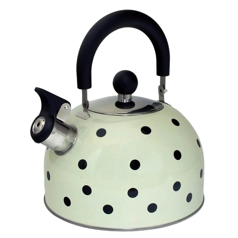 Add a touch of class to your kitchen with the 2.5 Litre Cream with Black Polka Dots Stainless Steel Whistling Kettle.